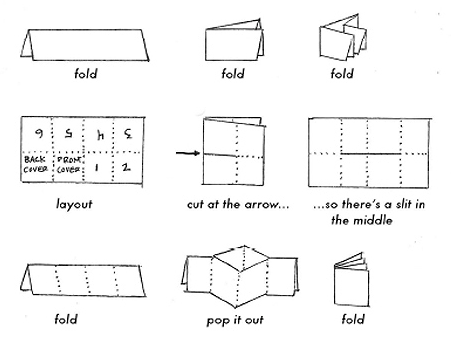 Here is a diagram of how to fold and cut it. OK, so I looked up the diagram after I made the zine. I took a scrap of paper and folded up a mock up and numbered it. My page numbers are a bit mirrored from the how-to diagram. My sheet is 1-8-7-6 (upside down) and 2-3-4-5 (right side up). It still works fundamentally like the diagram, just make sure you fold the cover to the very outside.