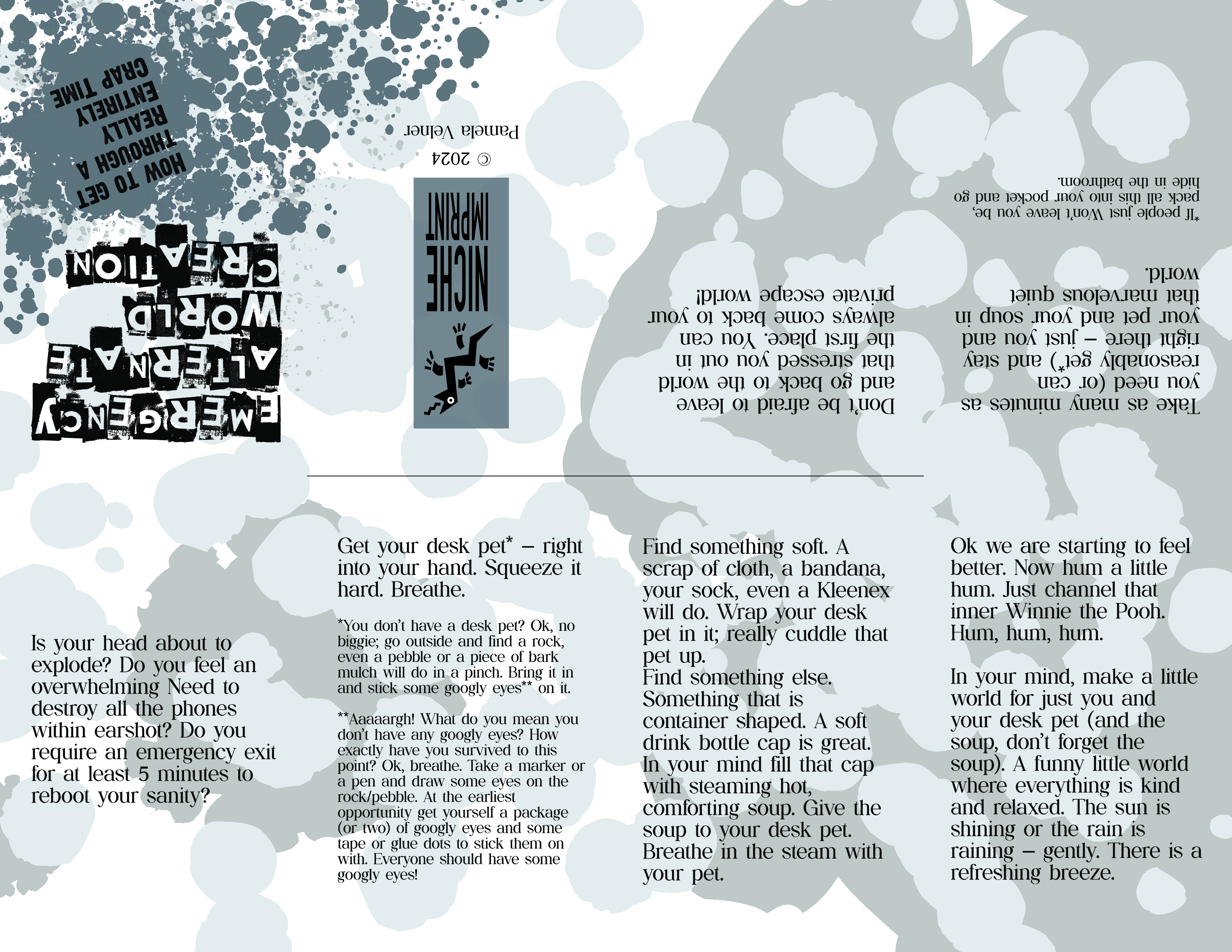 It’s a one sheet 8 page mini zine. The inside (poster) side of the sheet shows my personal desk pets enjoying a lovely cup of bottle cap soup! Side note: The books they are leaning against hold up my monitor to a nice and proper viewing height.