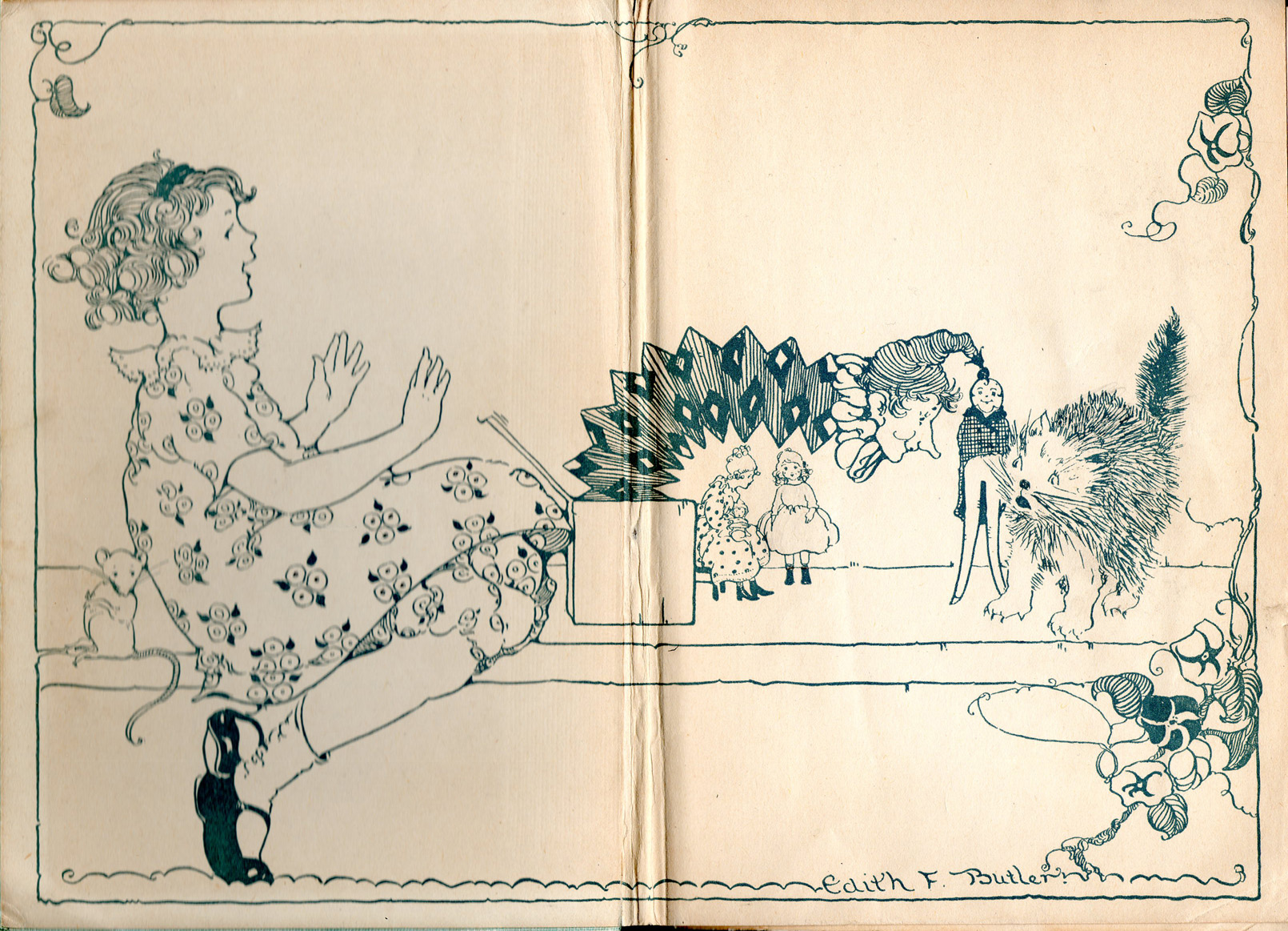 Part One is her original paper dolls and their clothes. Each doll has a personality profile including likes and dislikes, for instance, here’s Alice’s list: Likes: Cats, Books with pictures, Her usual height; Dislikes: Boring Lessons, Disorderly tea parties, Egomaniacal Monarchs. Here’s my favorite personality list item . . . Dislikes: Being Poked (Baby) and yes, before you wonder, Baby is just that; a little rosy-cheeked human baby who looks like the kind of tiny baby doll that sort of slumps warm and cozy in the palm of your hand. Part One also includes a section of background paintings, and a toy theater.