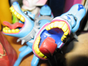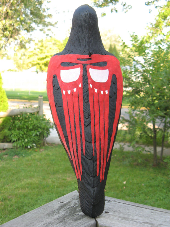I decided to do mine up as, well, Raven. It just seemed like too good an opportunity to do some native american art to pass up. I modified some northwest coast clip art images and made stenciled fabric appliqués which I then glued in place. I used freezer paper stencils to apply white paint to orangey-red fabric. The stylized hands on the wings were fiddley to glue on but I’m pleased with the final effect.