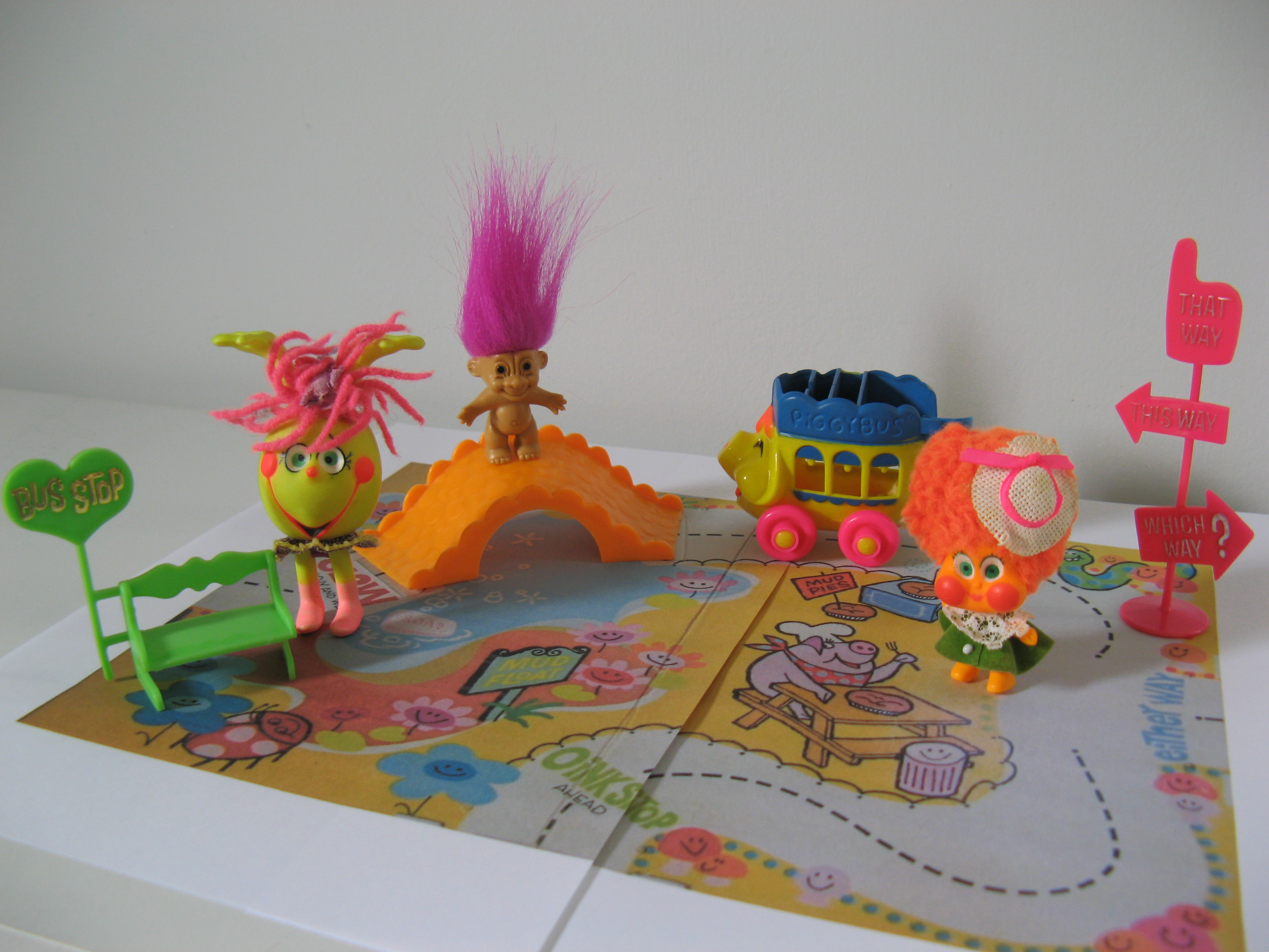 I remember playing with these trippy tiny people when I was little, first you’d connect up all the maps you had and then they would drive and drive and drive around. Occasionally they’d stop for a sandwich or a swim or sometimes a nap. It was a pretty idyllic flat little world but there were hazards — like the time the wizzer (with doll attached) went screaming across the kitchen floor and smacked our Mother right in the ankle (oh the shouting, oh the temporary banishment to our room).