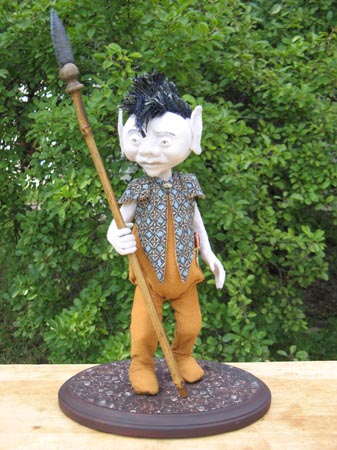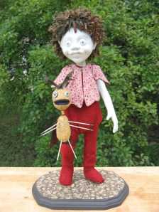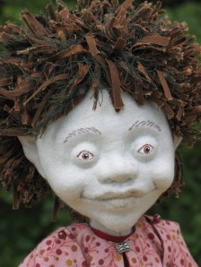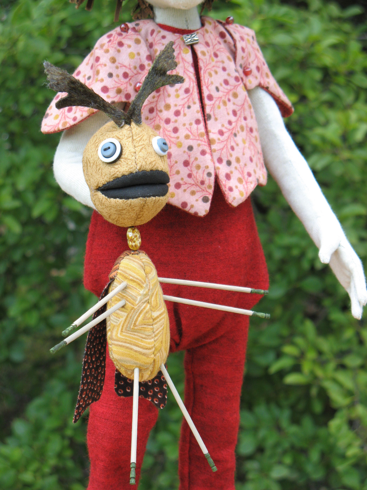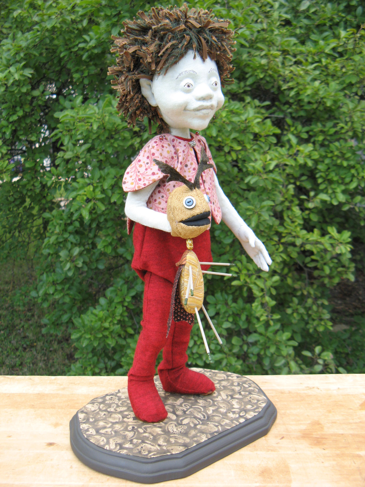 Other notes: tuning peg electrodes for a quick energy boost, unequal size eyes ala the Scarecrow from Oz, Wooden shoe on the leg he ripped off a Dutch puppet, large left arm ripped off a different puppet, a built-up shoe so he can walk mostly evenly, and fabulous wood curl pompadour bangs. He has one of my jackets but I made it a sort of Lederhosen-Bolero. I had a Great Deal of fun with this one!