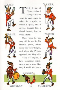 The Chatterlings in Wordland, by Michael Lipman is a fascinating and delightful vocabulary/grammar textbook (disguised as a storybook) from the early twentieth-century. It teaches the necessity of using the most precise word possible in order to communicate what you really mean. Yes, instead of making people guess (“well, you know what I meant”), actually just saying what you mean in the first place. Wow, what a novel idea! Which requires that you learn the sometimes not so subtle difference between the meaning of different words — oh drats; that’s vocabulary — arrggh! Well, this beautiful little book does it in an entertaining, indeed enjoyable, way. Here’s the beginning of the story:
