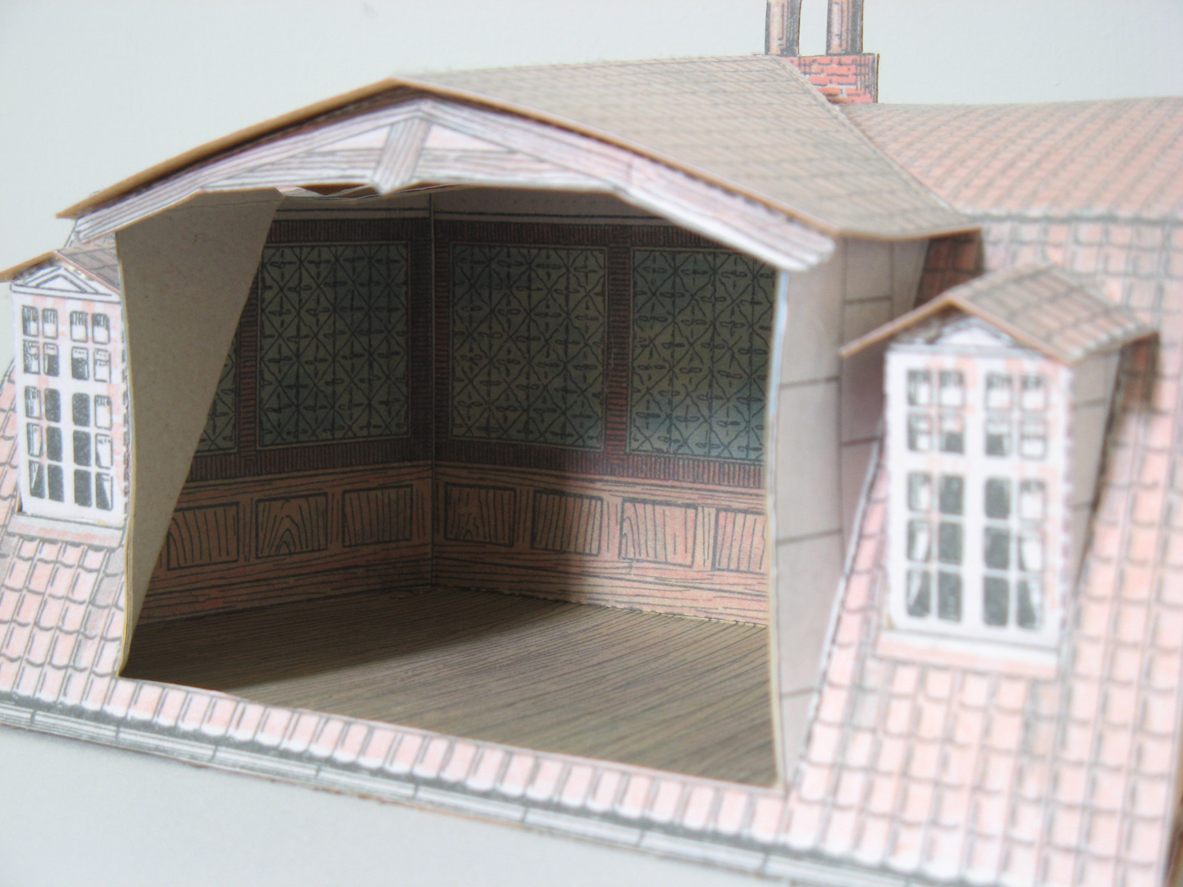The actual assembly went smoothly, all the parts were well designed and fit together as they should. The only problem I had was that I should have just used plain card stock for the attic dormers. The cardboard was a bit too thick and made fitting them very fiddley. Also next time I would cut out the window panes; it’s too dark in that attic. It would be great fun to do this project again on a slightly larger scale and make little dolls to live in it.