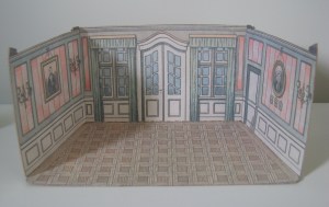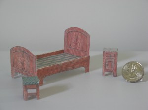 This is a trial run of a little paper dollhouse that is made of ink-jet printouts fused to cracker and cereal box cardboard. The files were sent to me by Esben (a very generous toy theatre fan) from Denmark. The dollhouse was originally published in Illustretet Family Journal in the first part of the 20th century. This was a Danish magazine that included a great many paper models including some fantastic toy theatres. Since this is just a trial I shrank all the parts down to fit on 8-1/2 x 11 paper and didn’t pay strict attention to scale. The house turned out to be around 1/24 scale (1/2″ to the foot). Even at this size I can easily fit my hand into the attic to arrange the furniture and a friends six year old had no trouble at all playing with the house.