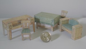The furniture is only partially cut out — those little white spaces in the chair  and table legs should normally have been trimmed but this was only a test. I printed the furniture sheets on plain white cardstock and didn’t fuse any reinforcement. They are surprisingly sturdy.